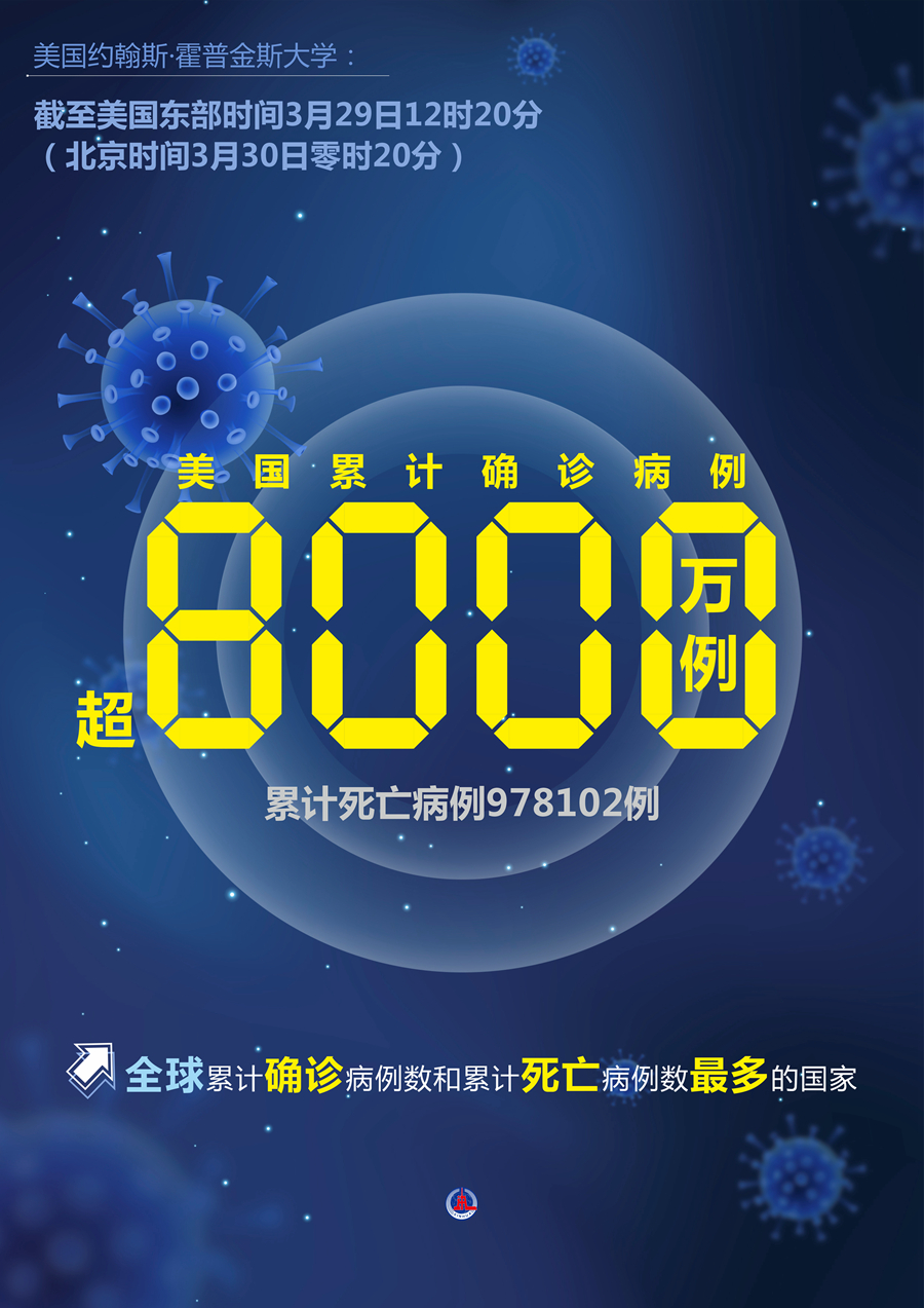 紐約3月29日電 美國約翰斯·霍普金斯大學29日發布的新冠疫情最新統計數據顯示,美國累計確診病例超過8000萬例。